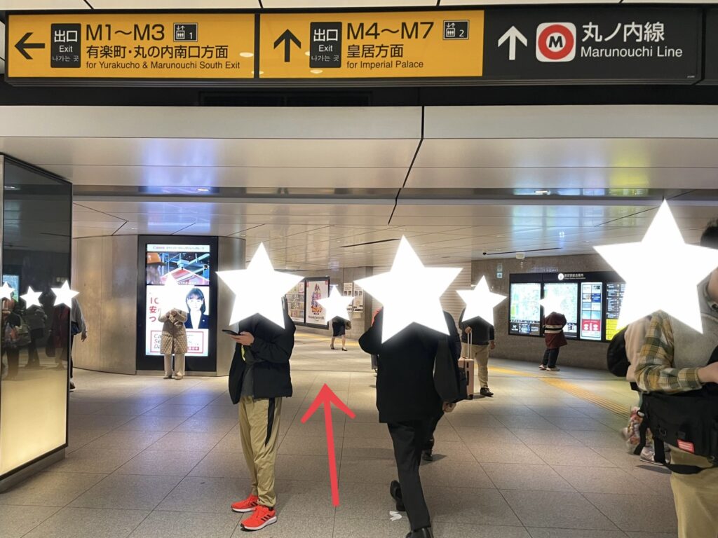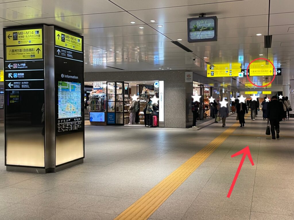 どうしても八重洲側に行きたい場合は、外の道路を通って行くこともできますが、駅の外に出るのでわかりづらく、有楽町方面まで歩かなければならないため時間もかかります。