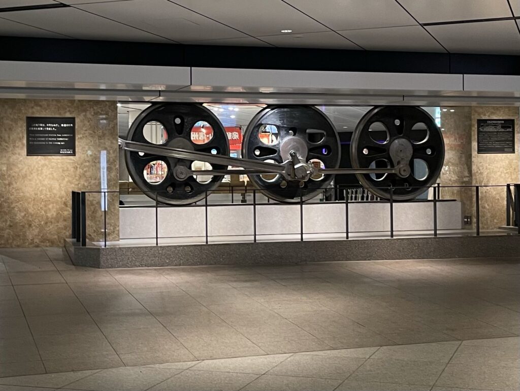 改札を出てすぐ右手にC62-15型蒸気機関車の動輪(どうりん)のモニュメントがあり、「動輪の広場」と呼ばれています。1971年に解体されるまで走っていたC62-15型蒸気機関車の本物の車輪が使われています。
