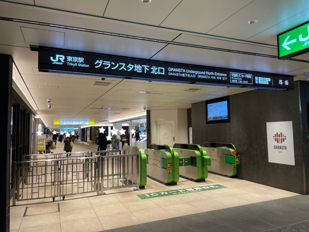 グランスタ地下北口は、北側の地下(B1)に位置する改札です。丸の内側と八重洲側をつなぐ北地下自由通路の、ちょうど真ん中ぐらいに位置します。